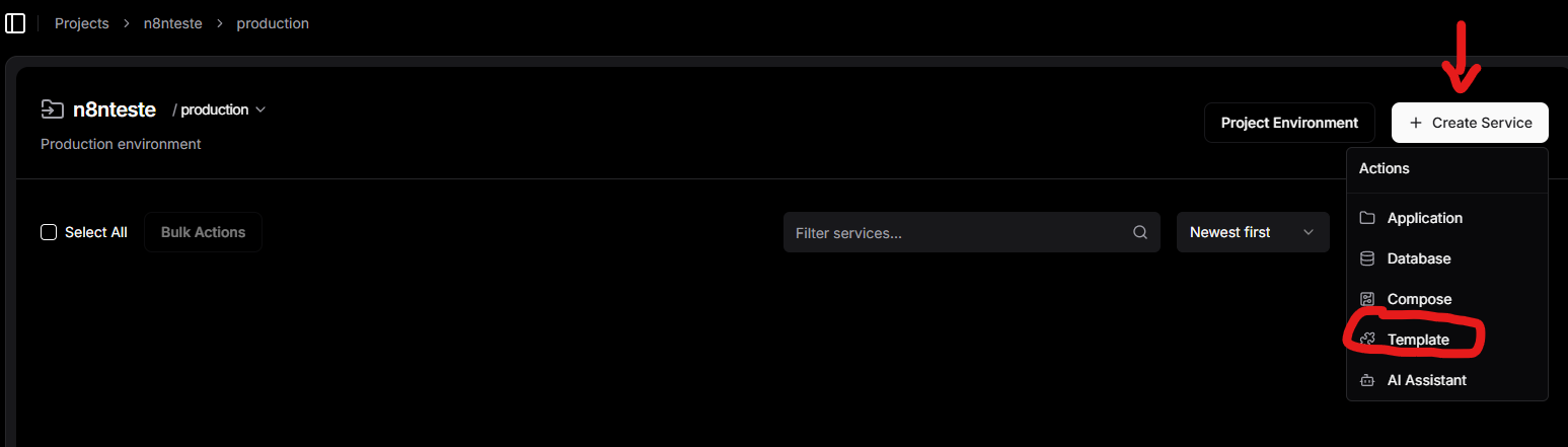 Terceiro passo: Clie em Create Service (criar serviço), selecione template e procure por N8N na barra de pesquisa que irá se abrir.