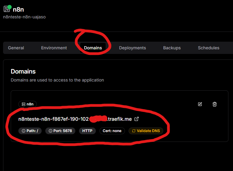 Sétimo passo: Clique em Domains e utilize a URL disponível para acessar a tela de login/cadastramento do N8N.