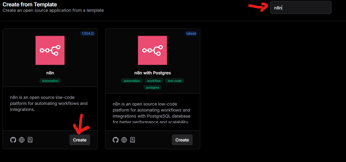 Quarto passo: Procure por n8n na barra de pesquisa, selecione a primeira opção e clique em create.