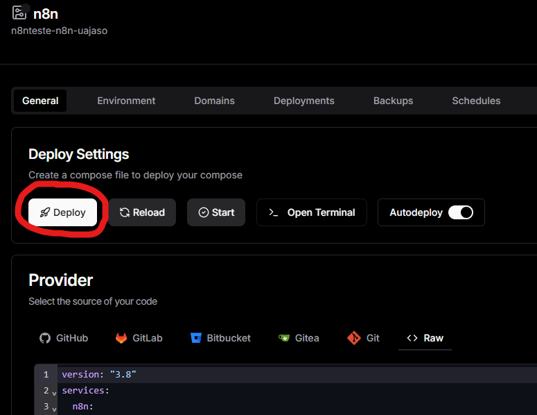 Quinto passo: Após criar o Template do N8N, a tela que irá se abrir será como a imagem abaixo, feito isso, clique em DEPLOY e confirme a ação.