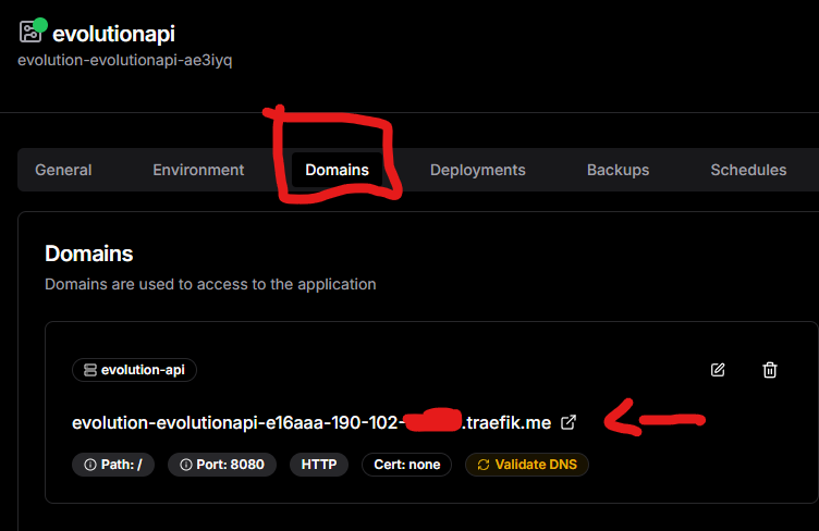 Sexto passo: Vá até domains e utilize a URL gerada pela aplicação para se conectar a tela de login da Evolution API.