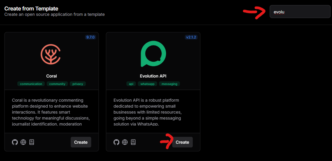 Segundo passo: Vá até a opção Create Service, Template e selecione o template da Evolution API.