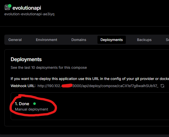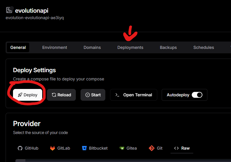 Quarto passo: Dentro da evolution api no painel do Dokploy, dê um deploy na aplicação e aguarde até que o procedimento finalize.